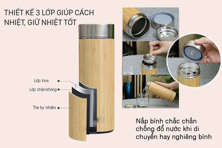 Cấu tạo gồm 3 lớp: inox, chân không và vỏ tre giúp thời gian giữ nhiệt tốt hơn, đem đến sự tiện lợi khi dùng. Ruột là inox 304, nắp là nhựa PP nên dùng lâu dài vẫn không gây ảnh hưởng xấu đến người sử dụng.