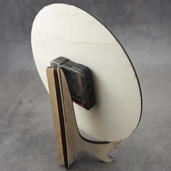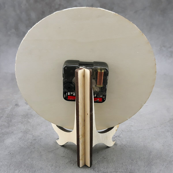 Đồng hồ gỗ khắc laser DH02 dạng tròn, kim trôi, phía sau là đế gỗ làm bệ đỡ. Có móc treo để treo tường. Diện tích to nên có thể khắc những tấm hình gia đình làm kỷ niệm.