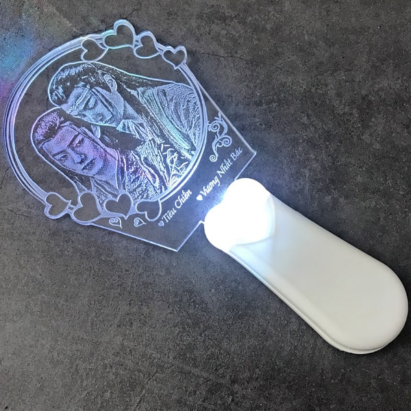Đèn có 7 màu, bấm nút giữa để chuyển màu. Lightstick của Legonna bao gồm đèn (bằng nhựa) và tấm mica trong suốt, được khắc laser theo yêu cầu. Bạn có thể khắc logo. icon hay ảnh chân dung đều được.